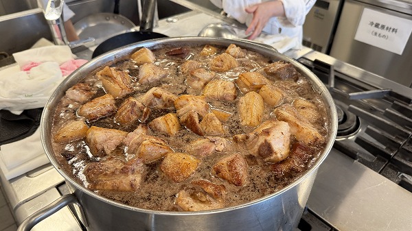 そして焼いた豚バラ肉を、キャラメル、赤ワイン、スパイスや鶏のだし汁等で煮込んでいきます。