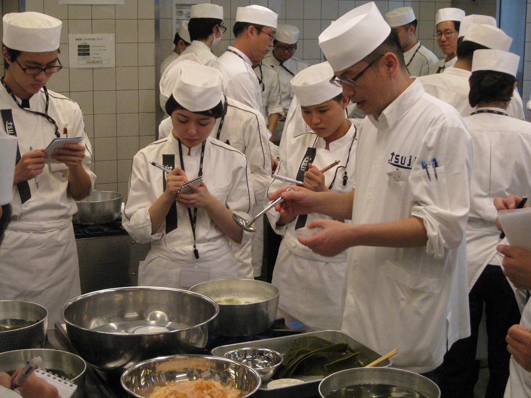 まずは先生が「一番だし」の引き方を実演!一生懸命にメモをして必死で味を記憶します。