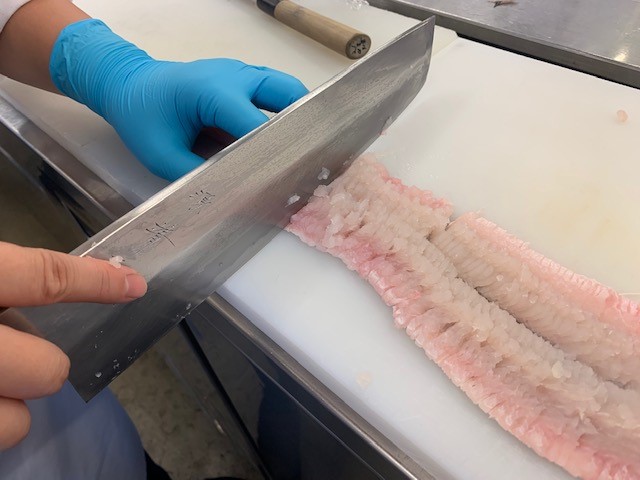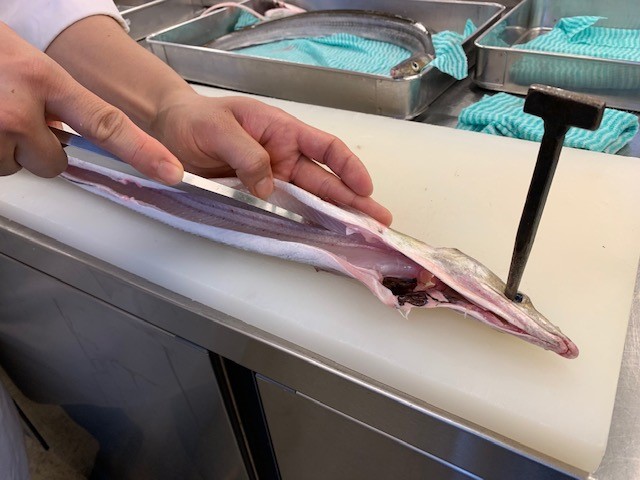1年生の時に調理理論で学び、2年生になって再度、調理技術理論でも学びましたが、実際に授業で初めておろす鱧にみんな苦戦!それでも基礎を習得しているので対応して上手におろしていました!