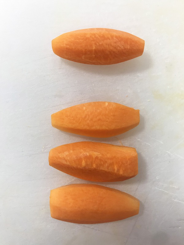 5cmの長さのにんじんをクルクル回しながら、細長いフットボールのような形に整えながらむきます。
