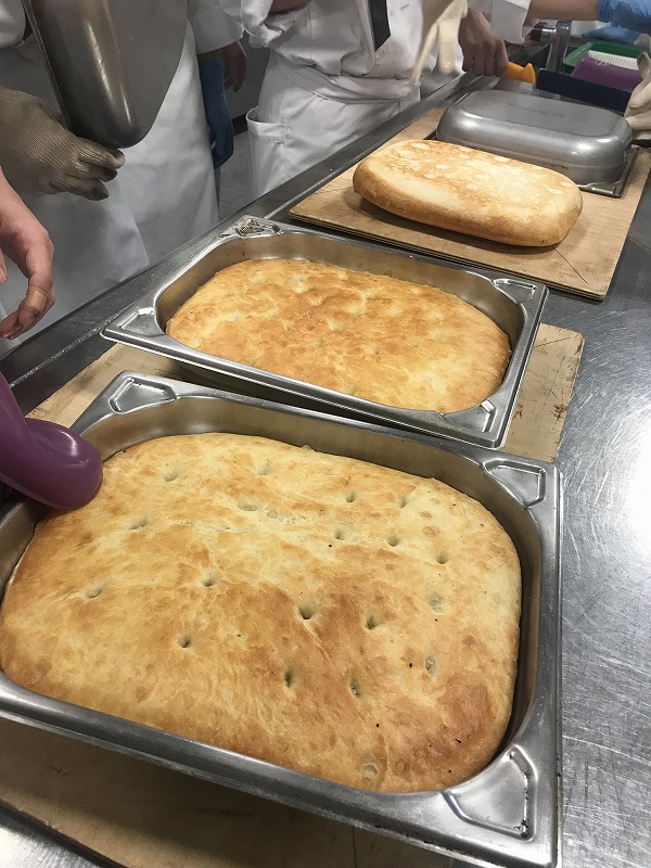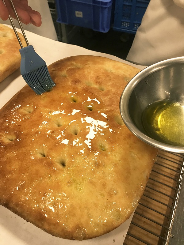 ふわふわしていて、焼き上がりにオリーブオイルをたっぷりと染み込ませて仕上げるので、