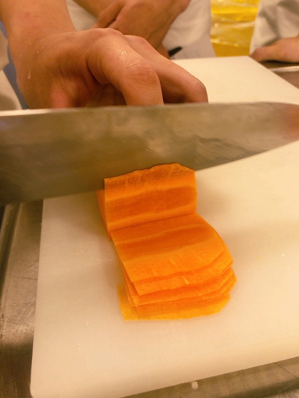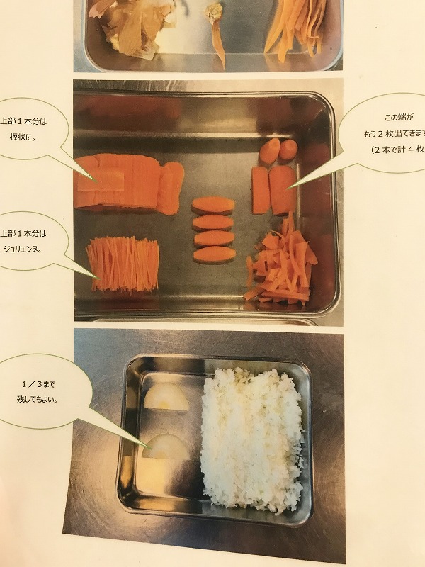 にんじんのトゥルネの写真、一番上がお手本で先生が剝いてたもの、下3個は学生が剝いたもの。