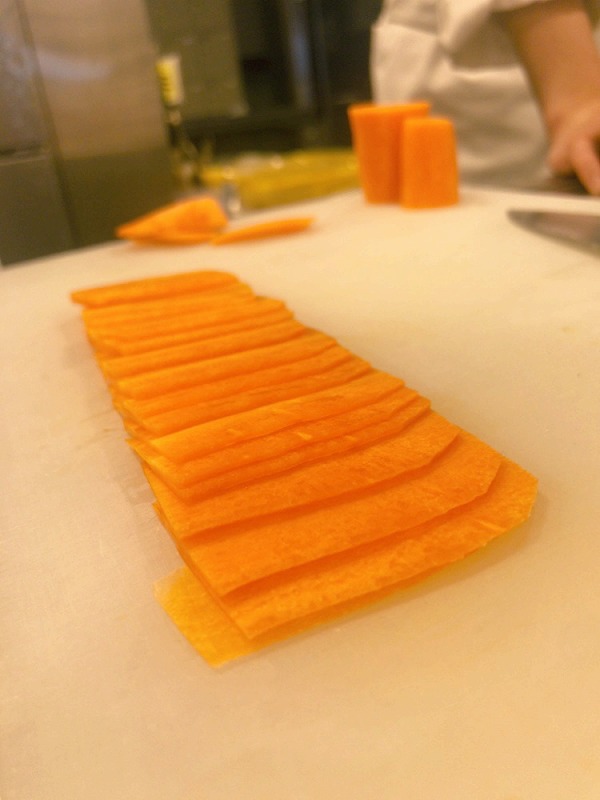 5cm長さに切ったにんじんを、端のほうから1mm厚の板状に切りそろえます。