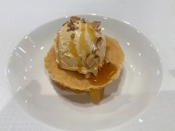 「りんごのシナモン風味のロースト、塩キャラメル風味のアイスクリームを添えて」