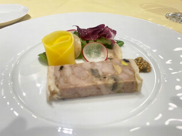 「肉のテリーヌ、フレッシュマンゴーとサラダ添え」