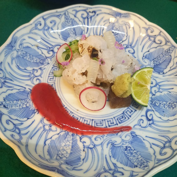 鱧焼き霜造りです。鱧ちりもいいですが、焼きちりも堪りません。