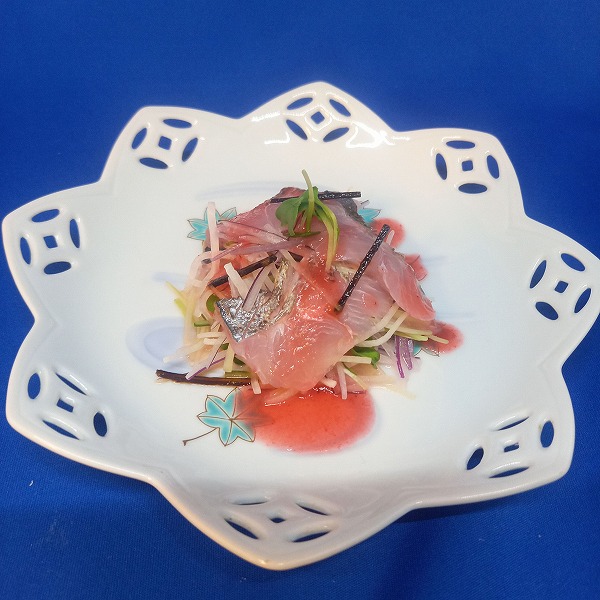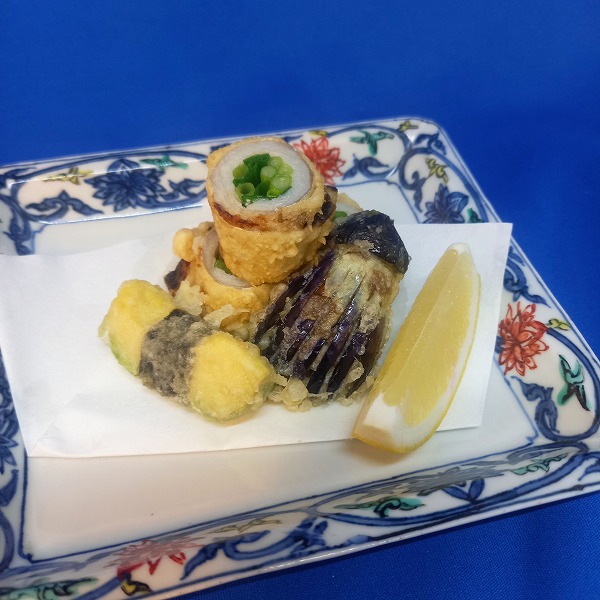 「焼き霜造りサラダ仕立て」に、青葱を芯にした天ぷら「太刀魚難波巻き」も勉強しました。