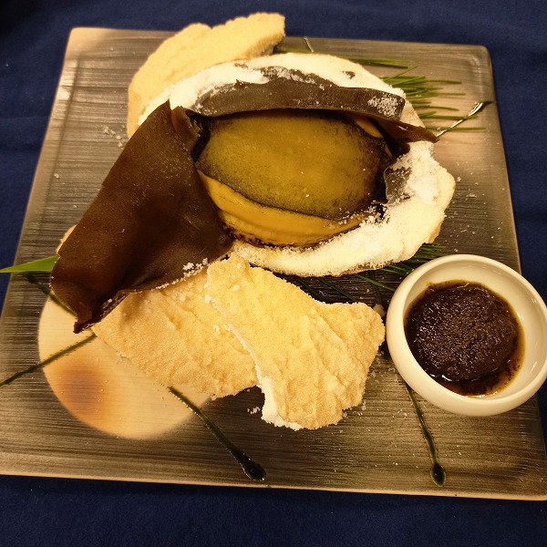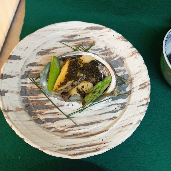 塩釜焼は鮑に間接的に火を通す蒸し焼き。