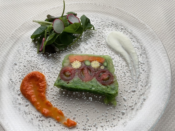 野菜のテリーヌを盛りつけてみると・・・彩りが想定と違う感じ。