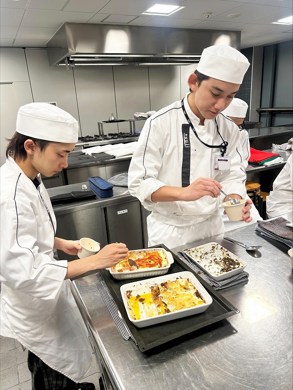 本番に向けて、先生と一緒にソースの味やバランスを確認しながら試作中です。