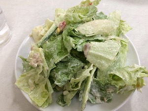 中身はレタス、キュウリ、カットしたトマト、ゆで卵、シーチキンでした。サラダは注文を受けてから野菜をカットするそうで新鮮そのもの!ドレッシングとしてマヨネーズとお砂糖でしょうか、酸味と甘みの組み合わせで食べる手が止まりませんでした!! これはぜひぜひ食べていただきたいです!!