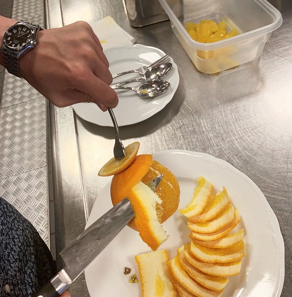 今回はフルーツのカット、リンゴ、オレンジが課題でした。お客様の前での作業なので、フルーツには直接手を触れずに、このようにフォーク・スプーンやナイフなどを使って切っていきます。これはお客様の目の前でフルーツを切る時、綺麗に切る事はもちろん周りを汚さないようにしたり、動きを美しく見せたりすることも大切です。この練習は学校で材料を仕入れてもらい先生方の指導のもと練習をすすめていきました。また、自宅に帰っても練習をして、おおよそ1人100個は剥いたと思います。