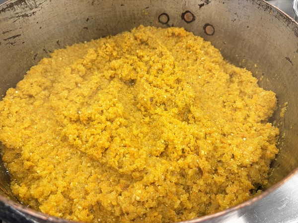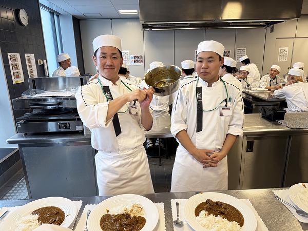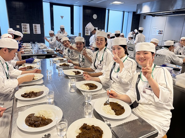 ある日の実習では、練習で細かく刻んだ玉ねぎを使って辻調特製カレーをつくりました。