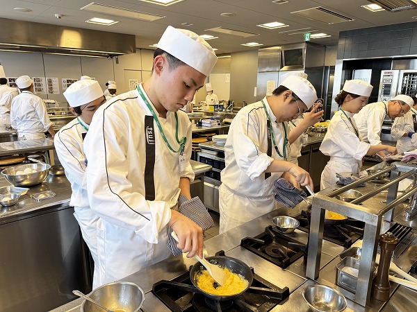 イメージトレーニングを積んだ後、いざ本番!真剣な表情でオムレツと向き合う学生たち。