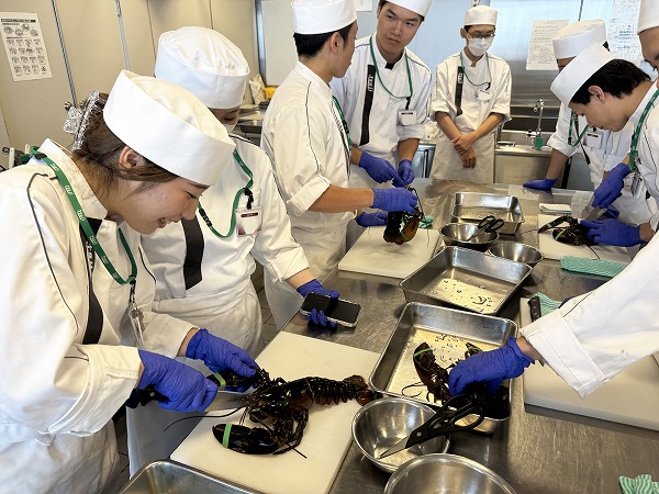 実習でこれほど多くのオマール海老を使用することは、普段では見ることのできない貴重な機会です。