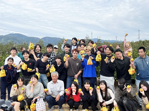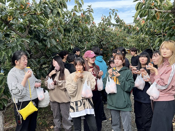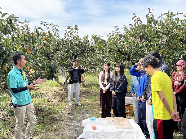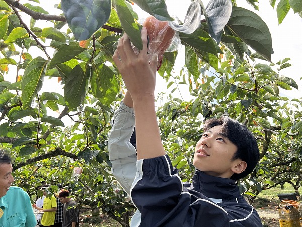 大きな柿を手に「家族に食べさせたいな」と話す学生の笑顔が印象的でした。