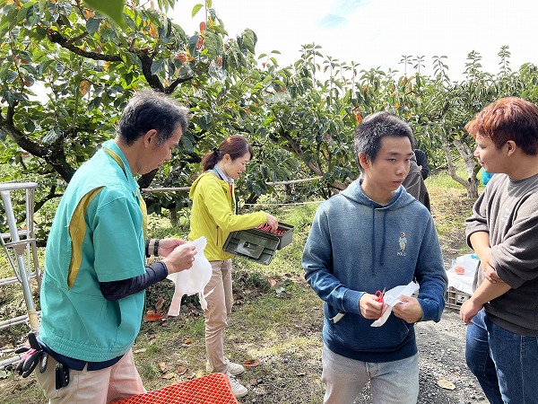 岡さんから「大きくて色の濃い柿を選ぶといいよ」と教わり、学生たちはハサミを手に畑へ散らばります。