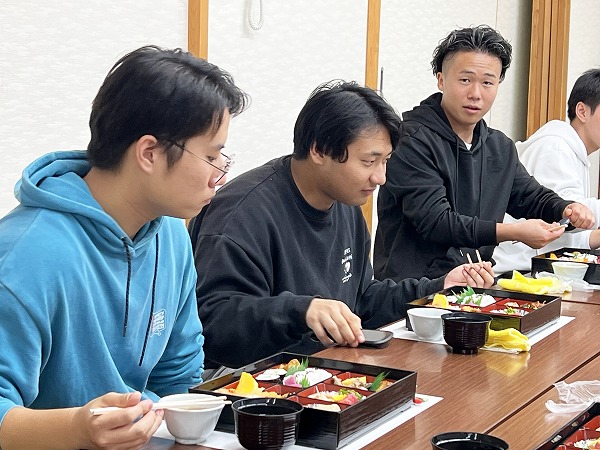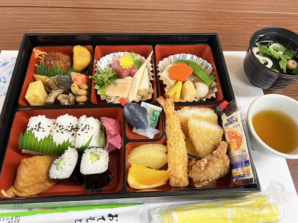 お待ちかねの昼食タイム。大部屋に並んだのは彩り豊かな幕の内弁当。