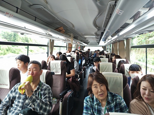 大型バスに乗り込むと、添乗員の長瀬さん、納谷さんからあいさつ。