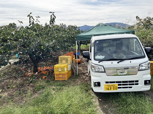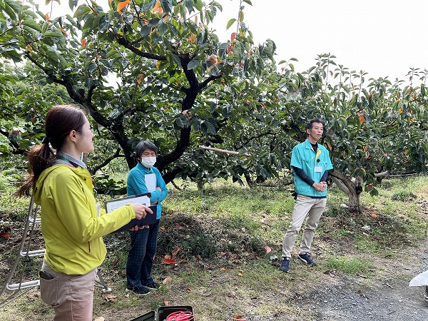 最初の目的地は、紀の川市の柿農園。迎えてくださったのは、農家の岡さんとJA和歌山の石梅さんです。