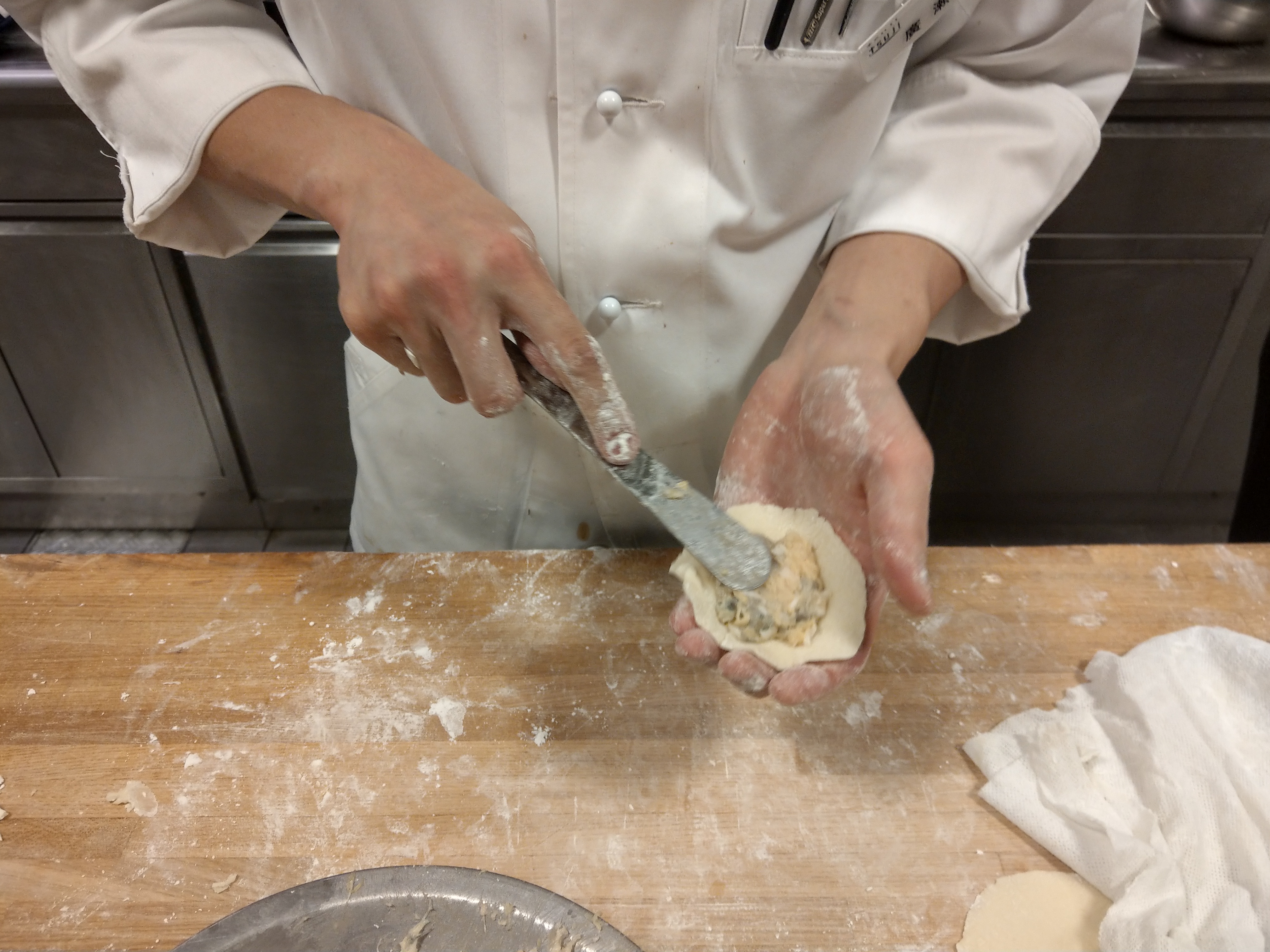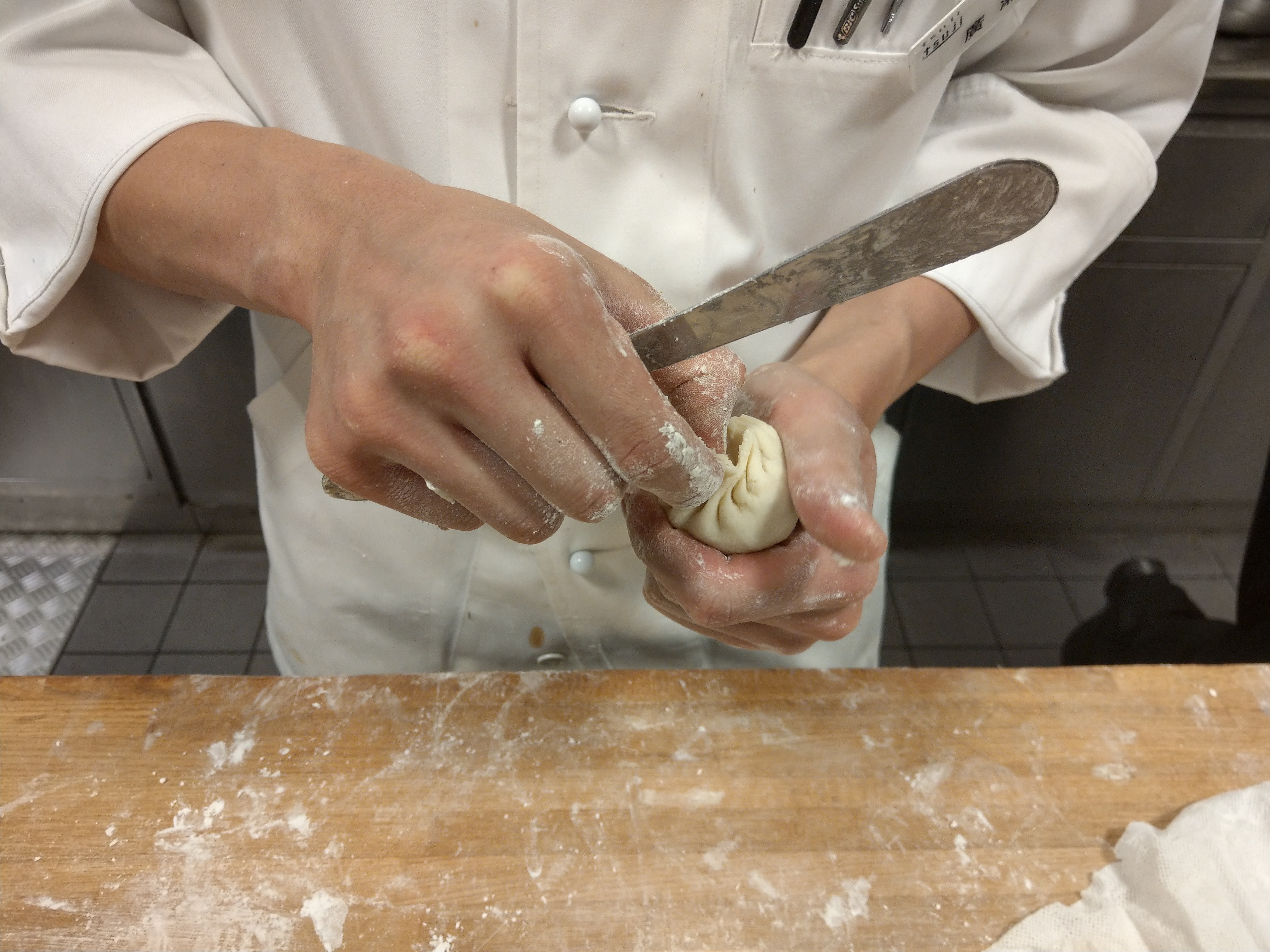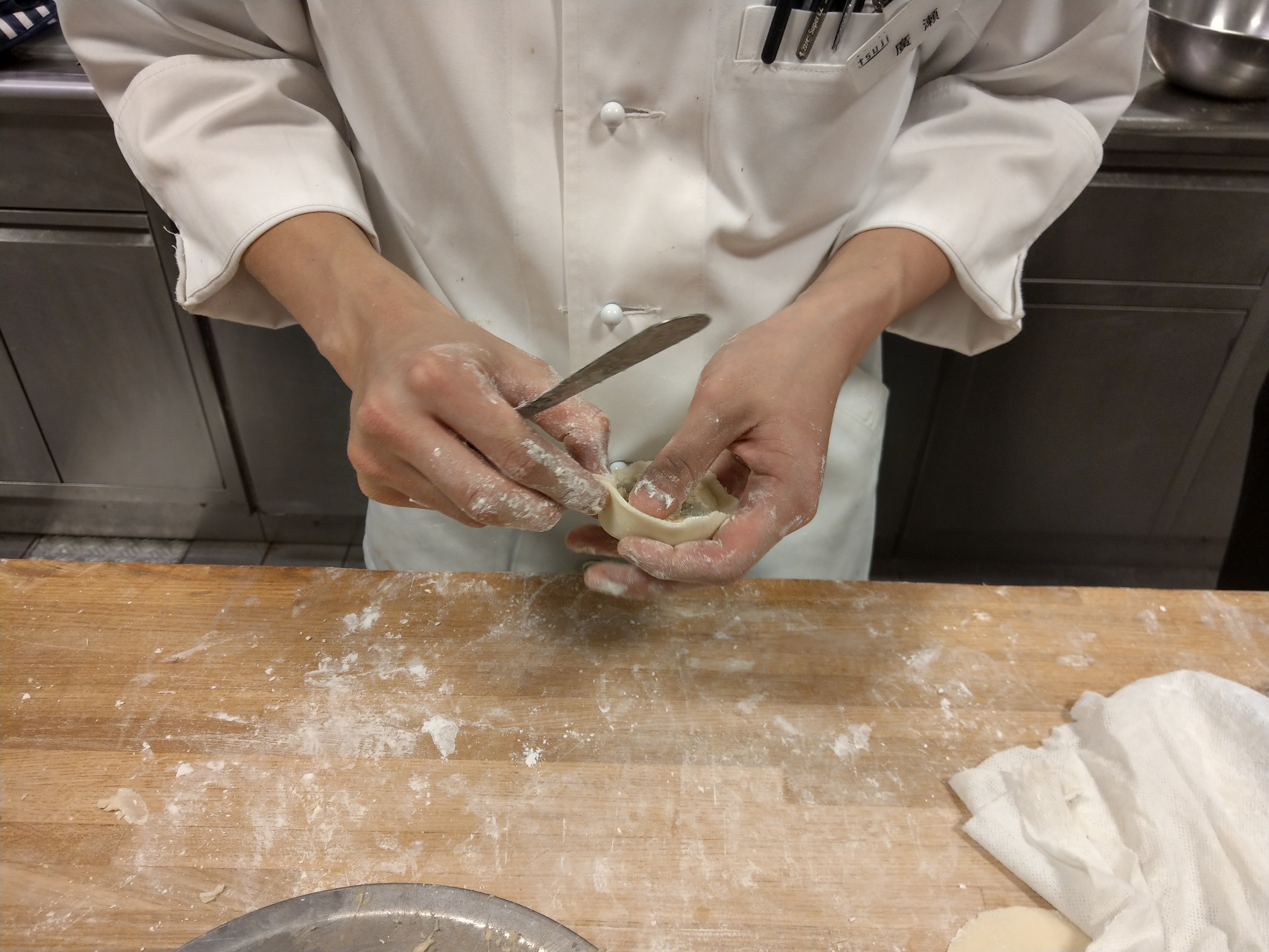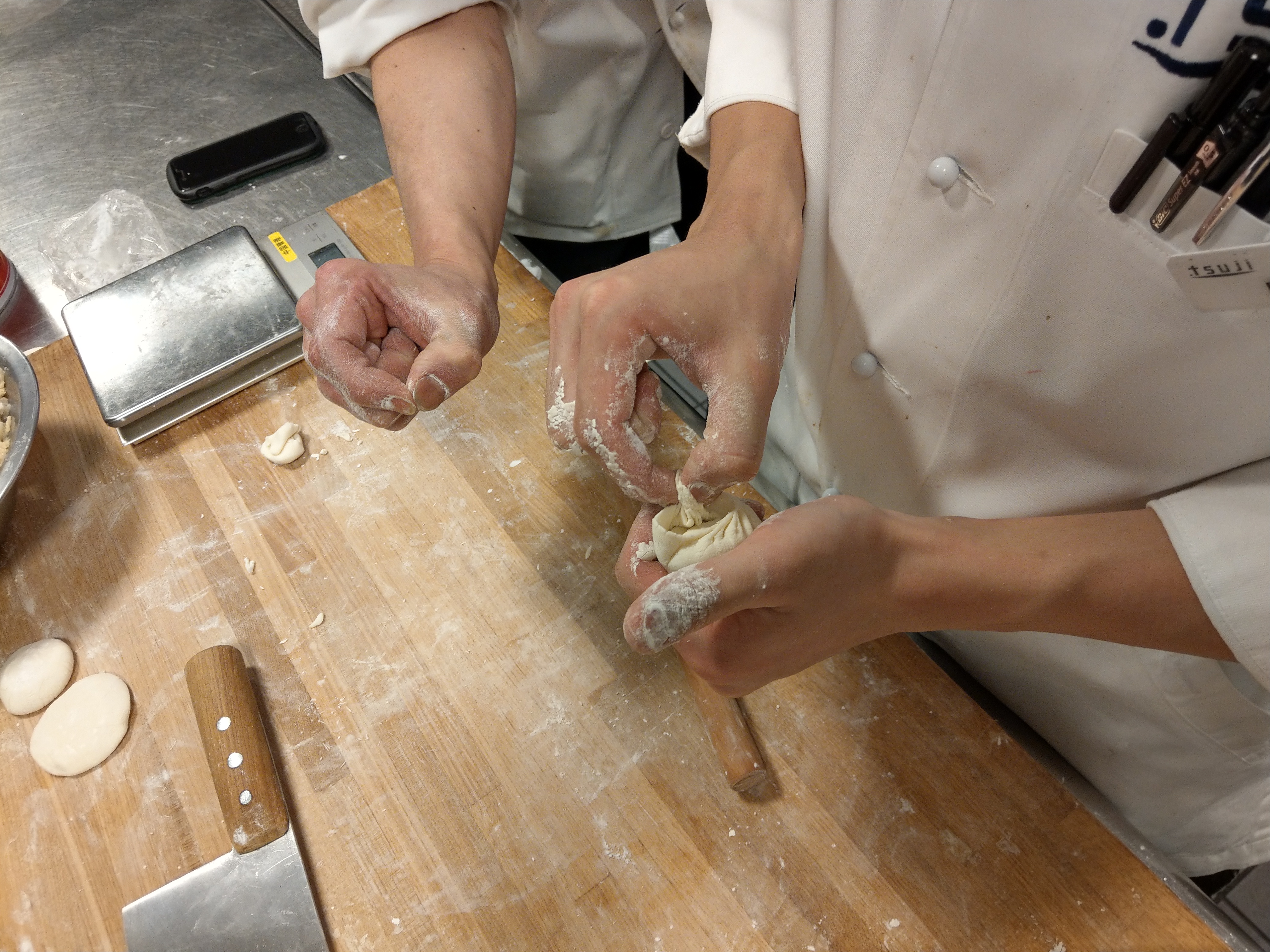 まずは餡を生地に乗せて・・・        ヒダを取りながら包んでいきます!
