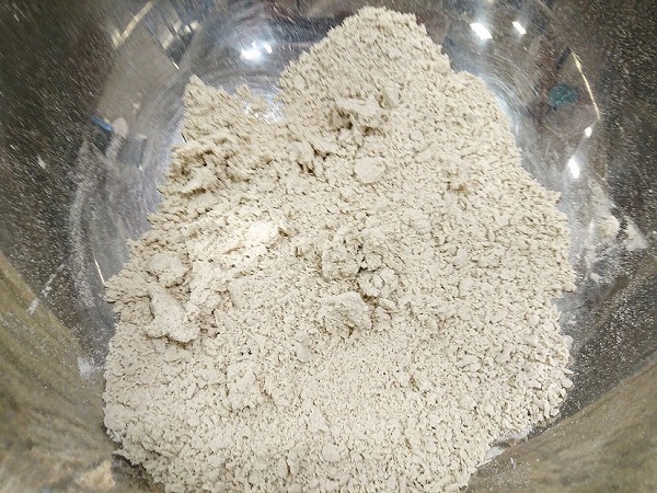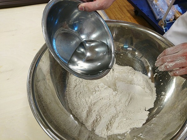 そこに水を加えてよく混ぜます。これを「水回し」といい、手早く行わないとそばがつながらない大事な工程です。加水率(水の量)はそば粉に対して42~45%です。