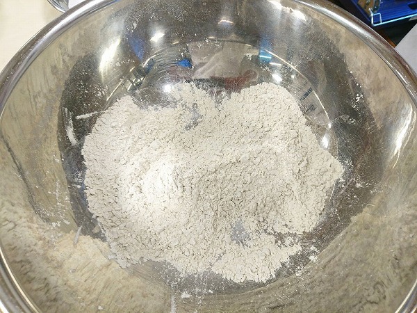 まずはそば粉とつなぎの小麦粉をしっかりと混ぜます。今日の分量はつなぎ二のそば粉八の二八そばと呼ばれるものです。