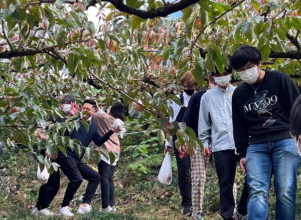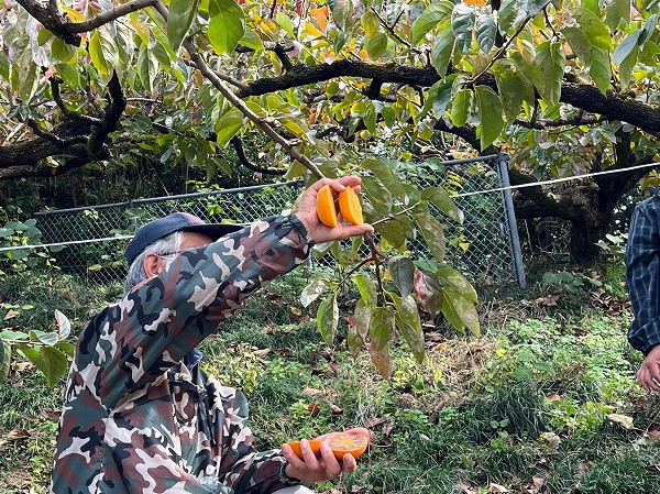 甘味の強い柿、歯ごたえの良い柿などの見極め方(料理用語:目利き)を伝授して頂き、いざ収穫体験です。