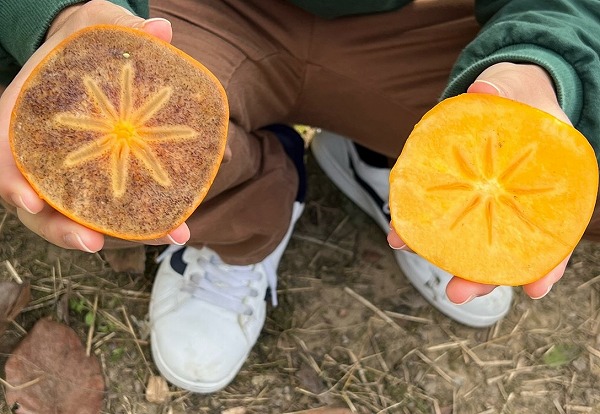 では渋の抜けた柿と渋が残っている柿の断面を見比べてみましょう!