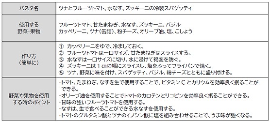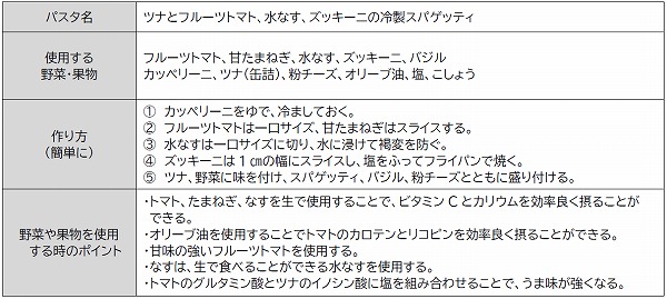 『ツナとフルーツトマト、水なす、ズッキーニの冷製スパゲッティ』。