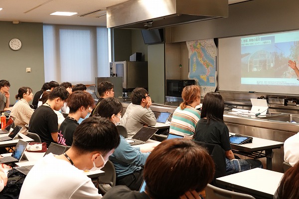 「食品と栄養」の授業では、講師がスライド等を使用して、説明を行います。
