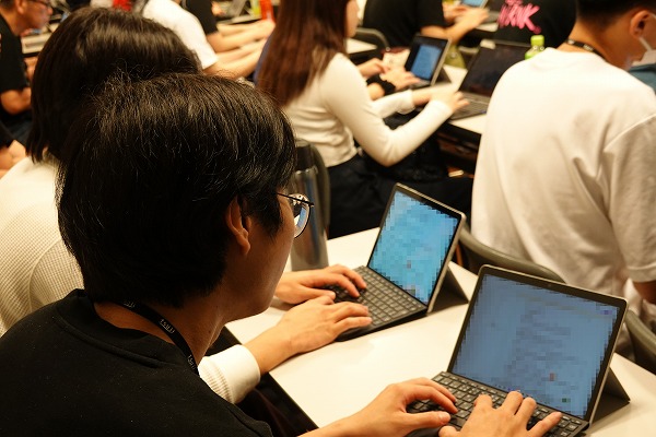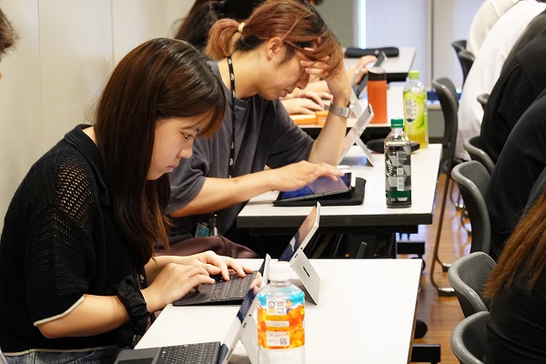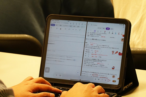 授業プリントがデジタル配布されるため、学生はノートパソコンで書き込みを行っています。