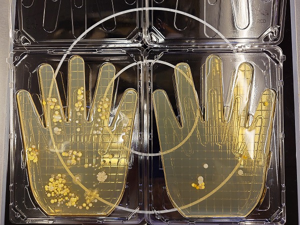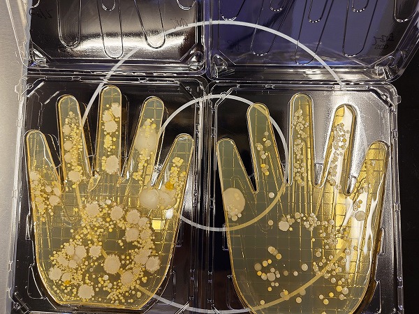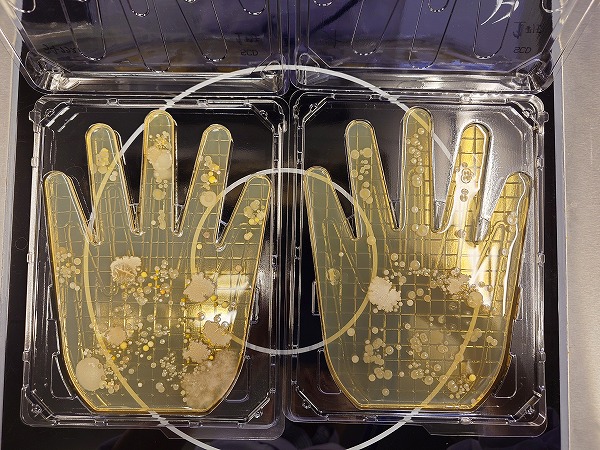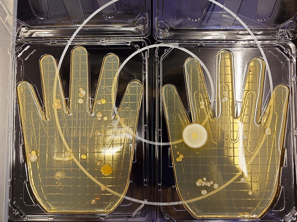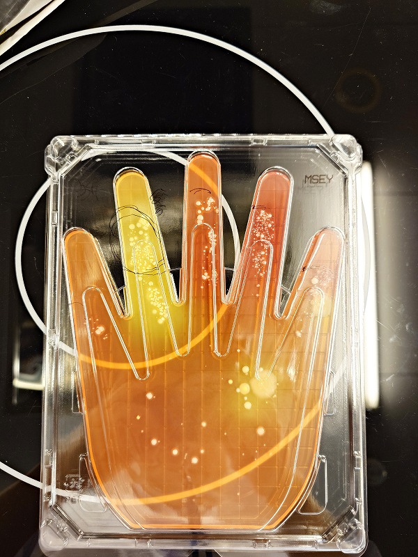また、参考に「手形培地(黄色ブドウ球菌用)」で、傷口に存在しているという食中毒の黄色ブドウ球菌も確認することにしました。