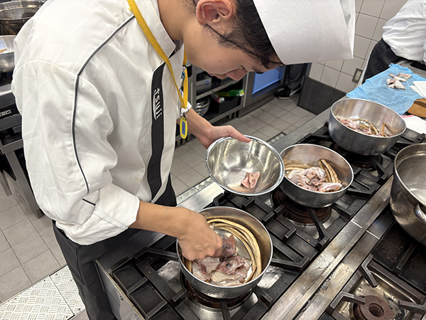 すべての料理を同時に最適な状態で提供するためのタイムスケジュール作成や役割分担、チームワークなど、現場に求められる実践力を養います。