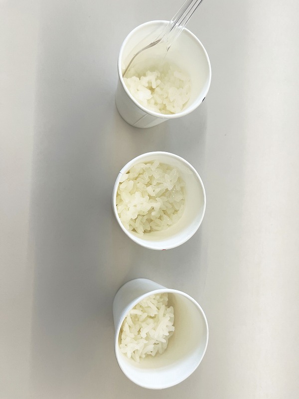 今回の試食では、あきたこまち・ミルキークイーン・ジャスミンライスの3種類を用意しました。