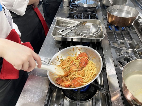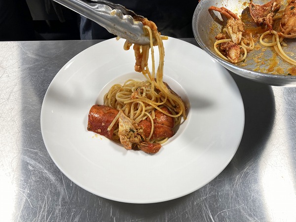 強火でオマール海老独特の香ばしさを引き出し、オマール海老の繊細な甘味を引き立てパスタ料理の完成です!