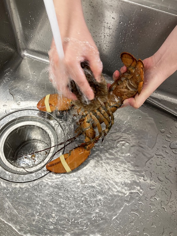 洗い終わったオマール海老はまな板の上に移動して。さぁ、捌いていきます。