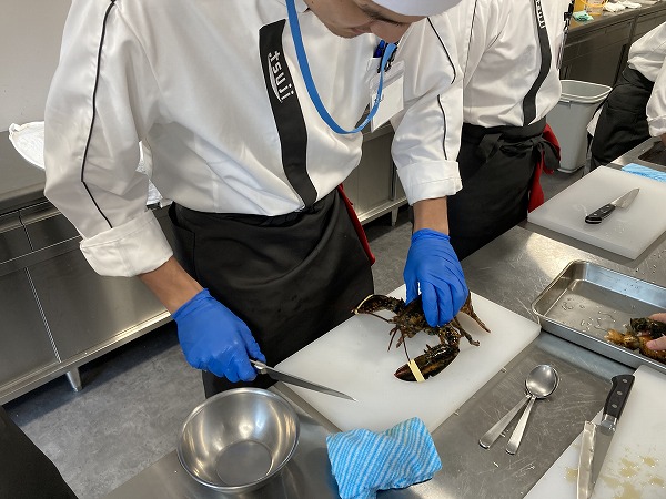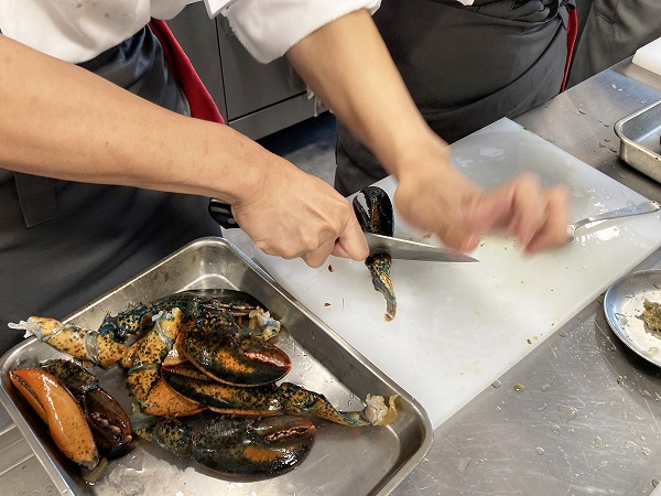 オマール海老は死んでしまうと臭いが出てくるので、生きているものを直前に処理して使用するのがポイントです。