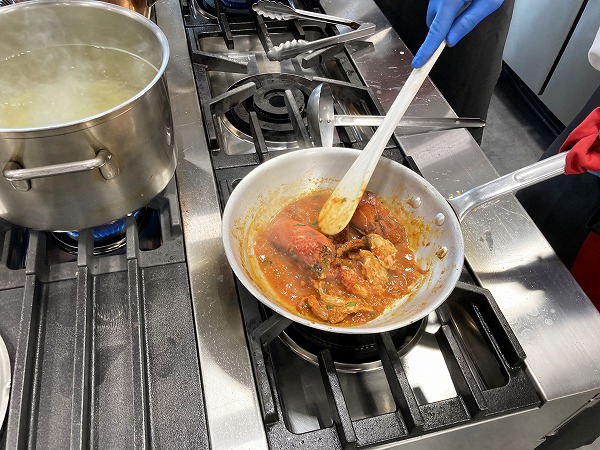 同時にパスタも湯がきながらタイミングを計り、ソースも味が馴染んでいくまで煮詰めます。