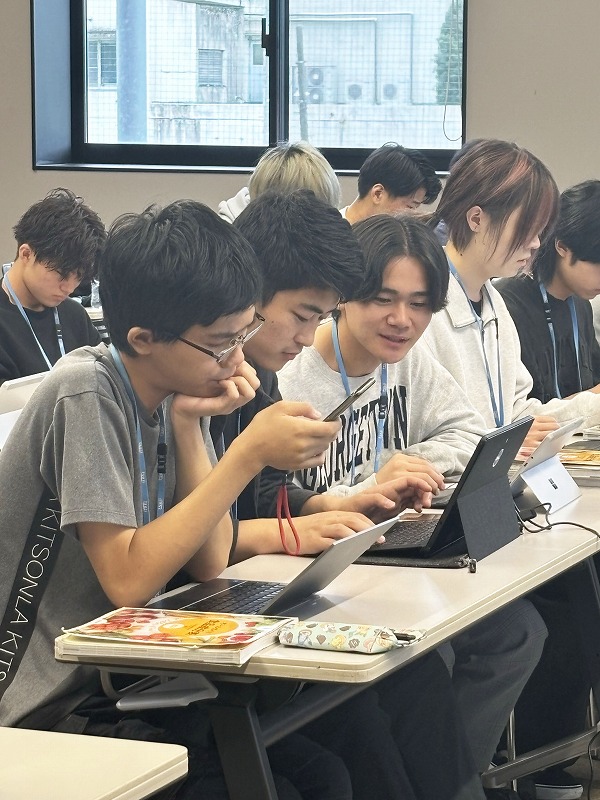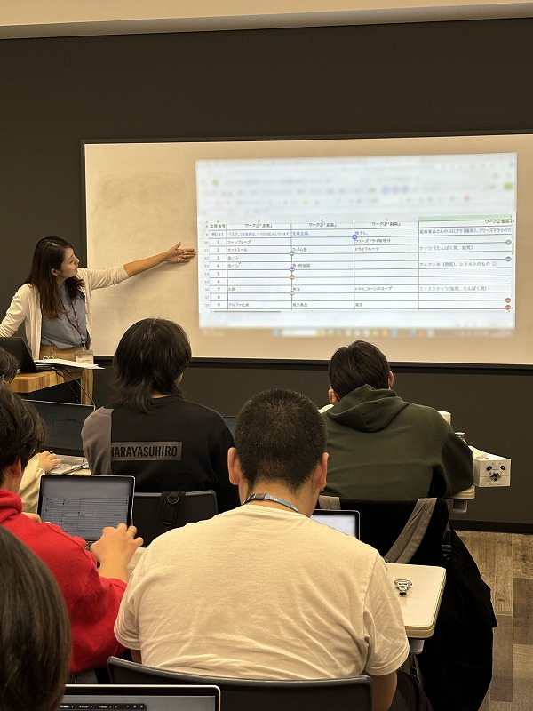 少人数のグループとなって話し合い、クラス全員で共有できるExcelのワークシートに自身の考えを記入していきます。