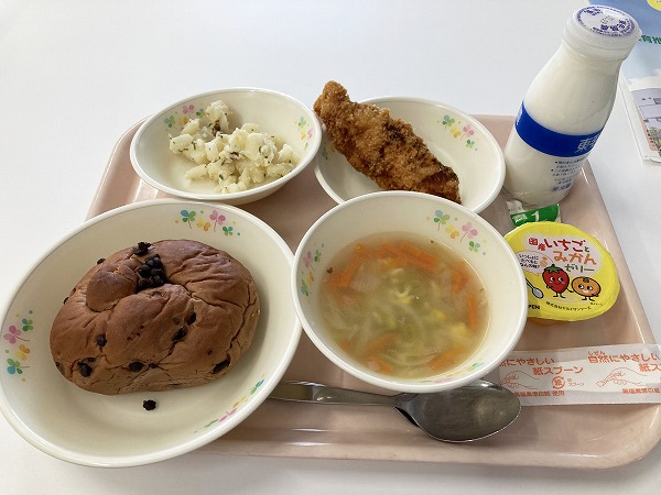 献立は、チョコチップパン、アルファベットマカロニスープ、鮭フライノンエッグタルタルソース、