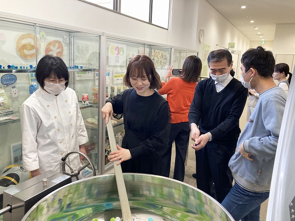 調理責任者の方から、回転窯でかき混ぜるコツを教えてもらい、順番に体験しました。