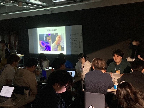 隣の教室で行われていた「食品の安全と衛生」の授業では、手洗いに関する実験が行われていました。