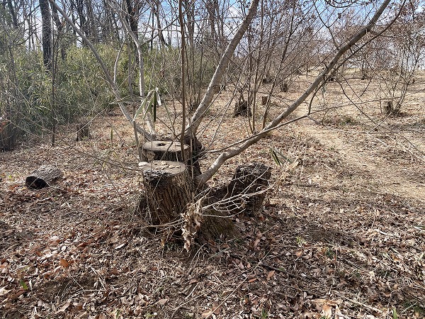 これは「萌芽更新(ほうがこうしん)」という、意図的に行われた作業と教えていただきました。