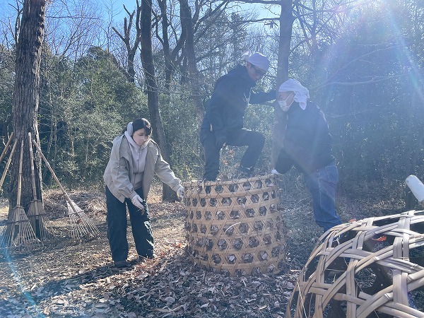 落ち葉掃きでは、竹製の熊手と、この地域では「ハチホン」と呼ばれる大きな籠を使います。