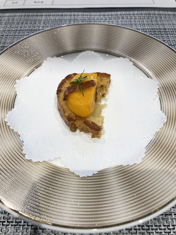 まずお付き出しとして一口サイズのフレンチトーストに、人参のピュレ、
