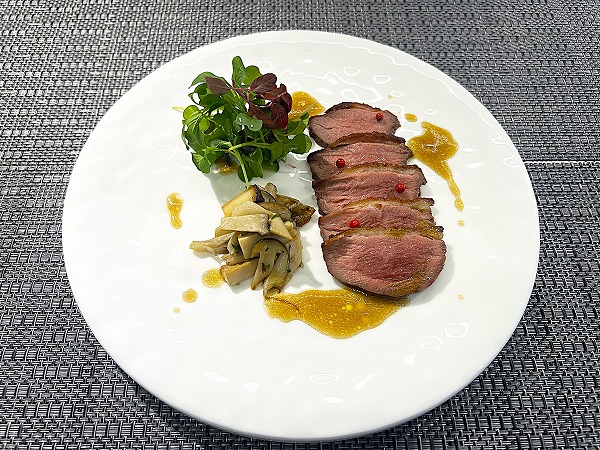 続いて前菜として、皮は香ばしく、身はジューシーに仕上げた鴨胸肉の燻製を、
