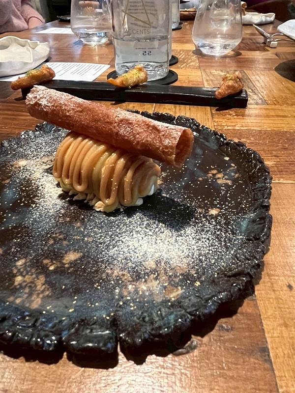 折角のパリです。三時間のフルコース。解説付きで料理や皿盛りデザートを楽しみます♪