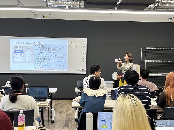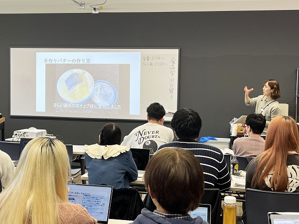 授業では、まずバターとはどのようなものなのか、中に含まれている成分についての理解を深めます。