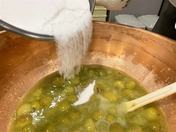 まず、大きな銅のお鍋に青梅と砂糖の一部、それがかぶるくらいの水を入れて火にかけます。